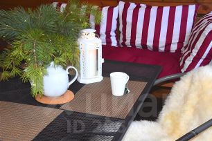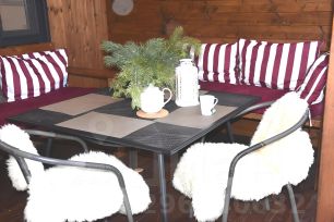-большая терраса с удобными диванчиками с плюшевыми пледами, для прохладных вечеров на веранде.