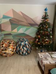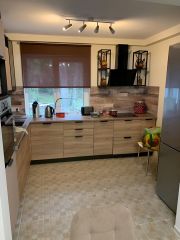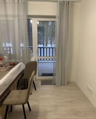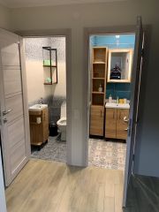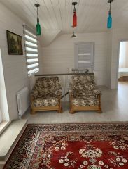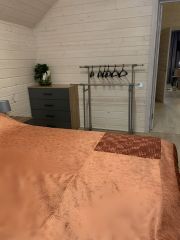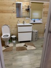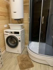 В доме на 1 этаже: гостевая спальня( диван раскладывается в 2-х спальную кровать 160*220); гостиная с раскладным диваном, кухня-столовая с выходом на террасу, раздельный санузел с душевой кабиной. Кухня оборудована полностью: посудомоечная машина, тостер, духовка, микроволновая печь, электроплита, холодильник. Полы с подогревом на первом этаже.