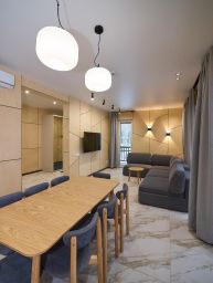 В доме просторная гостиная с раскладывающимся диваном, три отдельные спальни, кухня-столовая, 2 ванных комнаты, телевизоры: ТВ 55 дюймов в гостиной и ТВ 43 дюйма в мастер-спальне, высокоскоростной интернет/WI-FI, большая открытая веранда с комплектом уличной мебели для отдыха. Рядом с домом оборудована мангальная зона. Стоянка для двух автомобилей непосредственно у дома. Кухня полностью оборудована для длительного проживания: обеденный стол рассчитан на 8 человек, холодильник, электроплита 4-х конфорочная, СВЧ-печь, капсульная кофе-машина и машина для молотого кофе, чайник, полный комплект посуды и столовых приборов на 8 человек. Оснащение ванной: просторная душевая кабина с тропическим душем.
