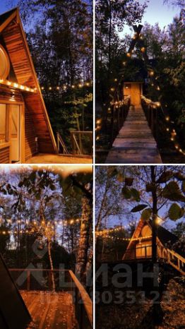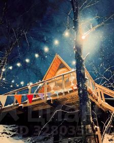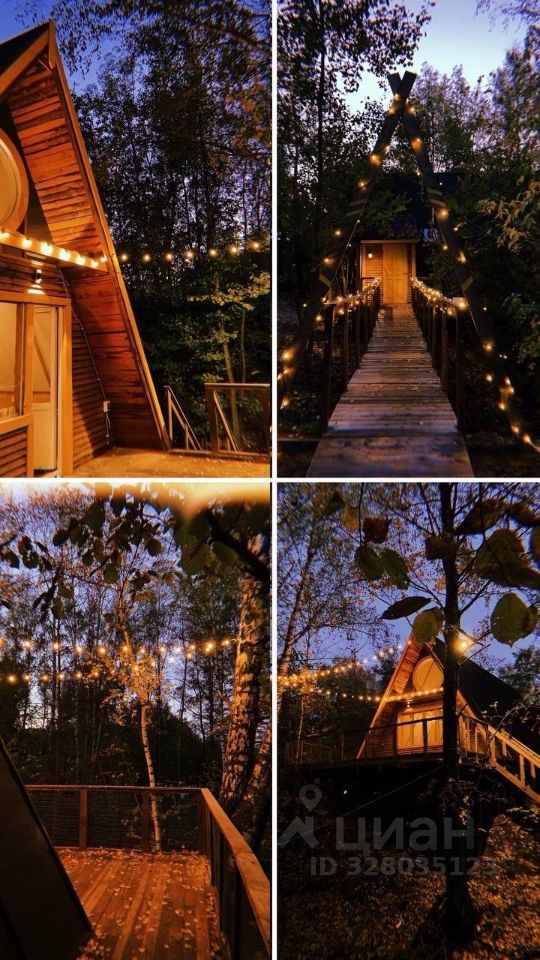 Вечером домик особенно красив — гирлянды создают тёплое, сказочное настроение.