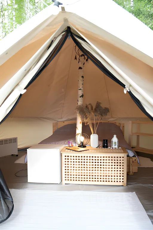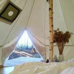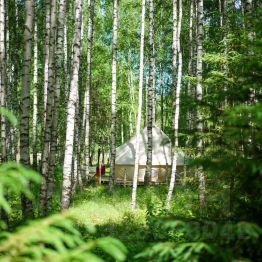 Комфортабельные шатры из натуральных дышащих материалов, хорошо удерживающих тепло. В одном шатре может находиться 2-3 человека. Освещенная территория, а также наличие электричества внутри. Рядом с шатром мангал и решетка.