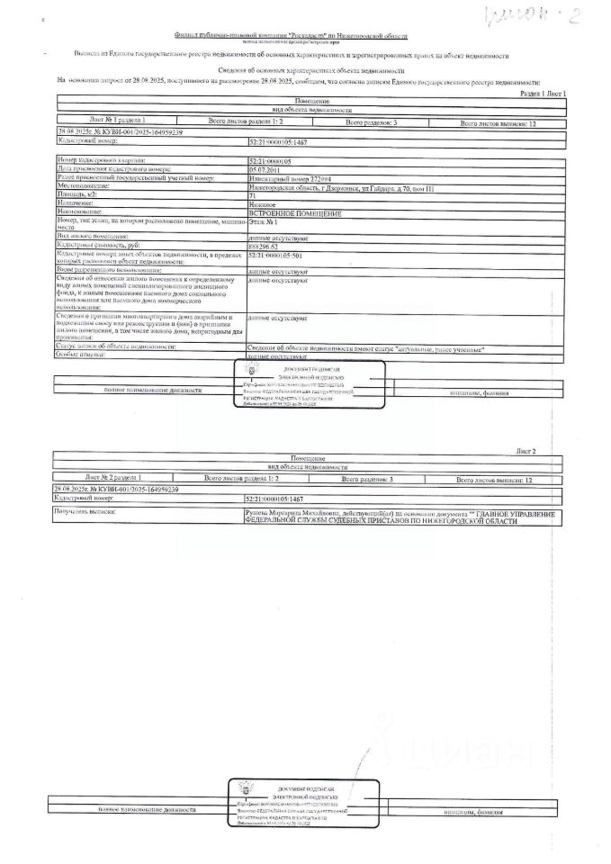 Встроенное помещение общей площадью 71 кв. м, кадастровый (или условный) номер 52:21:0000105:1467, назначение нежилое. Местоположение: Нижегородская обл., г. Дзержинск, ул. Гайдара, д. 70, пом. П1, этаж 1. Должник ООО "Тригон-2".