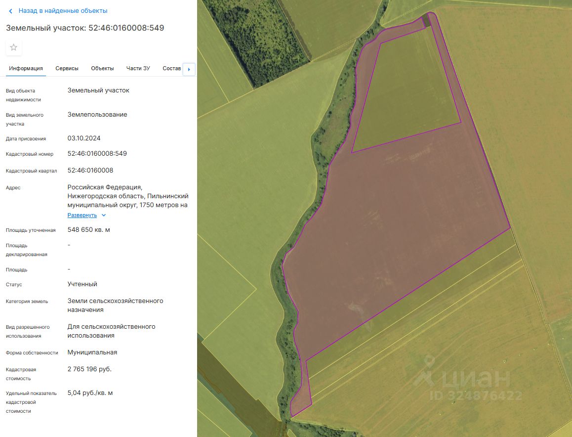 Нижегородская область, Пильнинский муниципальный округ, 1750 метров на северо-восток от н.п. Языково, кадастровый номер: 52:46:0160008:549, площадь: 548650 кв. м, категория земель: земли сельскохозяйственного назначения, вид разрешенного использования: для сельскохозяйственного использования.