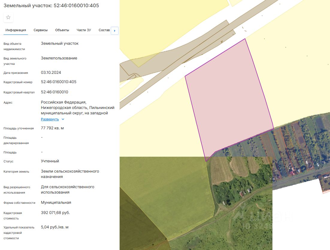 Нижегородская область, Пильнинский муниципальный округ, на западной окраине н.п. Языково, кадастровый номер: 52:46:0160010:405, площадь: 77792 кв. м, категория земель: земли сельскохозяйственного назначения, вид разрешенного использования: для сельскохозяйственного использования.