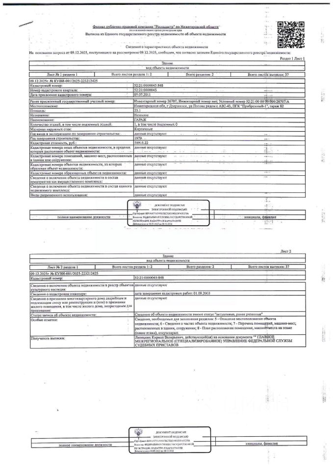 Здание (гараж) общей площадью 25, 1 кв. м, кадастровый (или условный) номер 52:21:0000045:848, количество этажей - 1, назначение - нежилое. Местоположение: Нижегородская обл. , г. Дзержинск, ул. Попова, рядом с АЗС-43, ПГК "Прибрежный-1", гараж 82