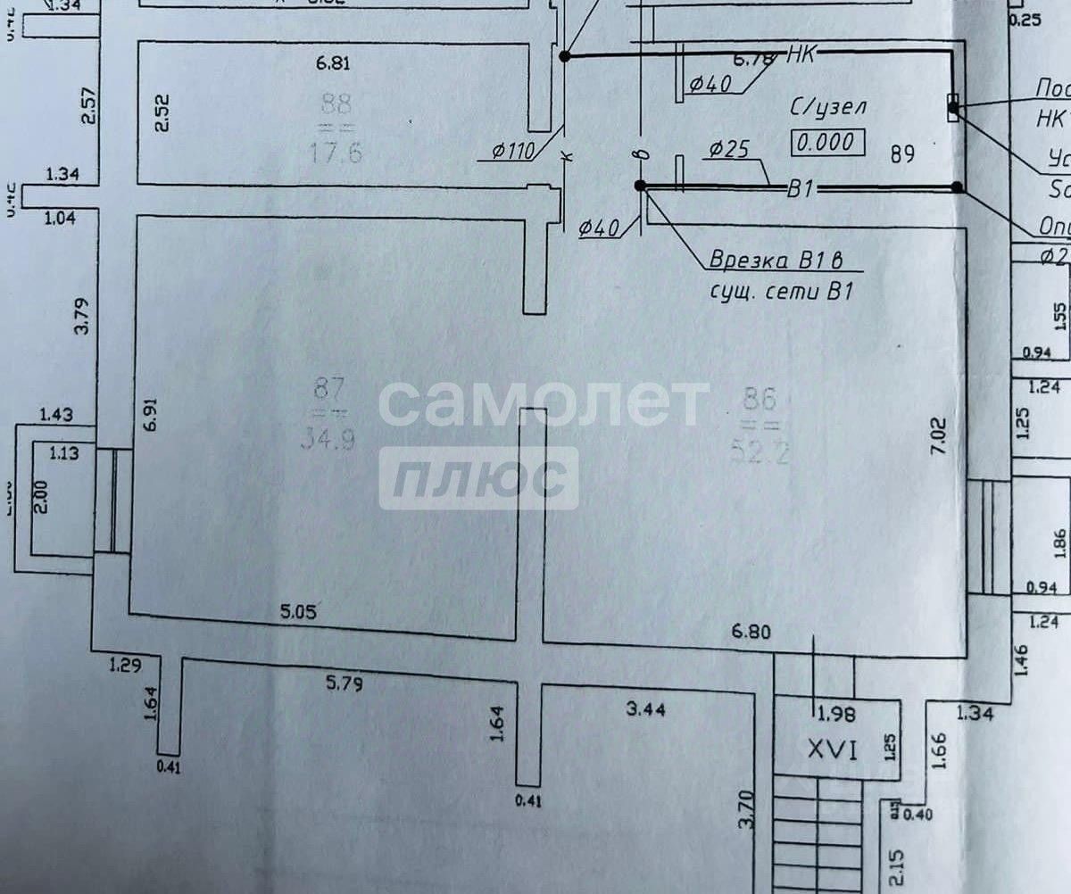 3 изолированных помещения площадью 17.6 м², 34.9 м² и 52.2 м².