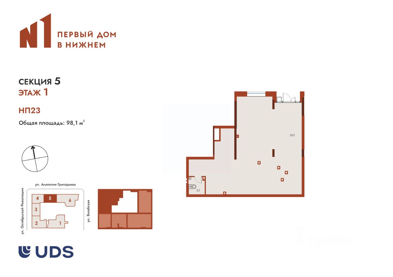 Коммерческое помещение на первом этаже в ЖК "N1 Первый дом в Нижнем". Это квартал бизнес-класса переменной этажности, расположенный в одной минуте ходьбы от станции метро Чкаловская. Через дорогу районная администрация и Парк им. 1 мая.