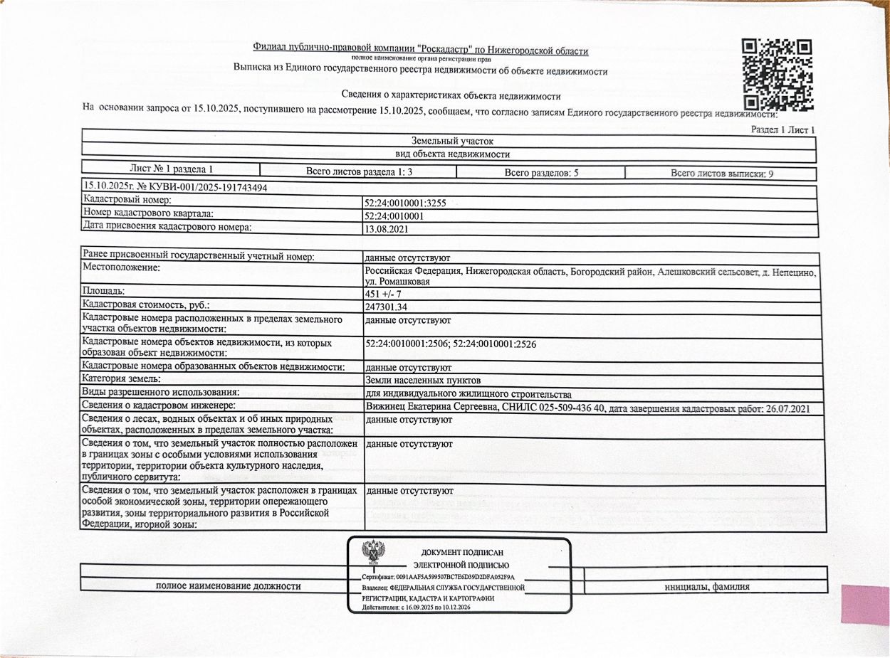 Земельный участок площадью 451 +/- 7 кв. м, кадастровый (или условный) номер 52:24:0010001:3255, категория земель - земли населенных пунктов, вид разрешенного использования - для индивидуального жилищного строительства. Местоположение: Нижегородская обл., Богородский р-н, д. Непецино, ул. Ромашковая. Должник Гарева С.К.