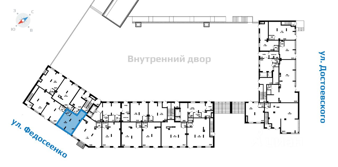 Всего в ЖК "2Д Федосеенко" на первом этаже расположено 18 коммерческих помещений площадью от 35,8 до 111,7 кв.м. (со стороны улицы - 12 помещений, со стороны внутреннего двора - 6 помещений). Вы можете приобрести несколько смежных коммерческих помещений и объединить их в одно. Подробности уточняйте в отделе продаж.