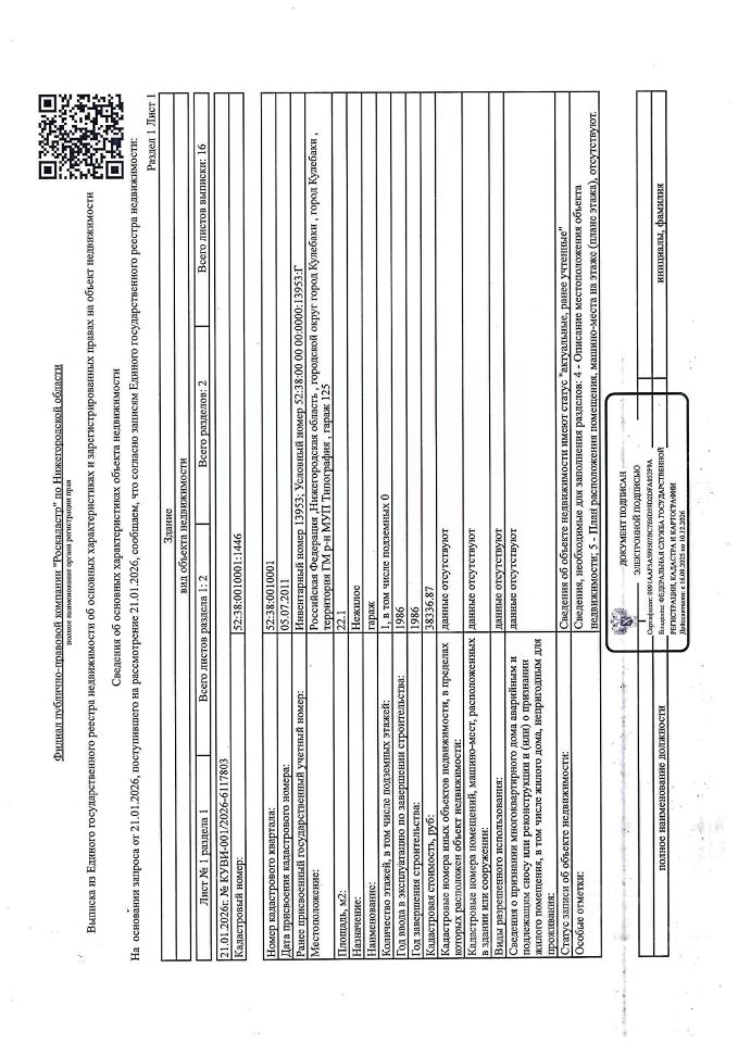 Повторные торги. Здание (гараж) общей площадью 22, 1 кв. м, кадастровый (или условный) номер 52:38:0010001:1446, количество этажей - 1, назначение - нежилое. Местоположение: Нижегородская обл. , г. Кулебаки, территория ГМ р-н МУП Типография, гараж 125
