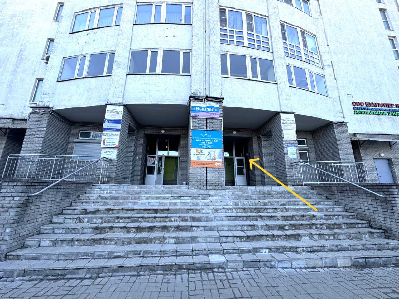 Расположен на 2-ом этаже многоквартирного жилого дома, первые два этажа коммерция.