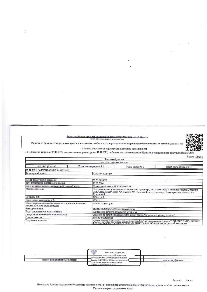 Земельный участок площадью 74600 кв. м, кадастровый (или условный) номер 52:55:0070009:780, категория земель - земли сельскохозяйственного назначения, вид разрешенного использования - для ведения личного подсобного хозяйства. Местоположение установлено относительно ориентира, расположенного в границах участка. Ориентир СПК "Дивеевский", поле 6, участок 3. Почтовый адрес ориентира: Нижегородская обл., Дивеевский р-н. Должник Кондратьев С.Б.