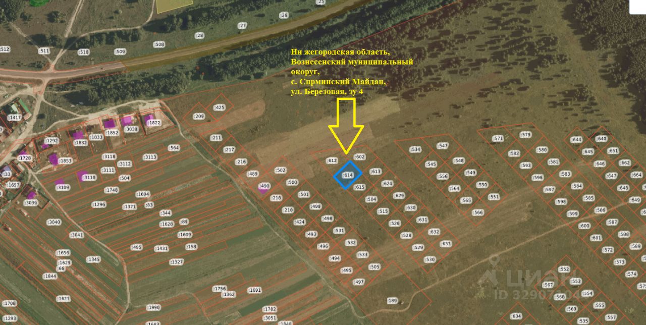 Российская Федерация, Нижегородская область, Вознесенский муниципальный округ, с. Сарминский Майдан, ул. Березовая, земельный участок 4, кадастровый номер 52:54:1400003:614, площадь 1200 кв.м., категория земель - земли населенных пунктов, разрешенное использование земельного участка для ведения личного подсобного хозяйства.