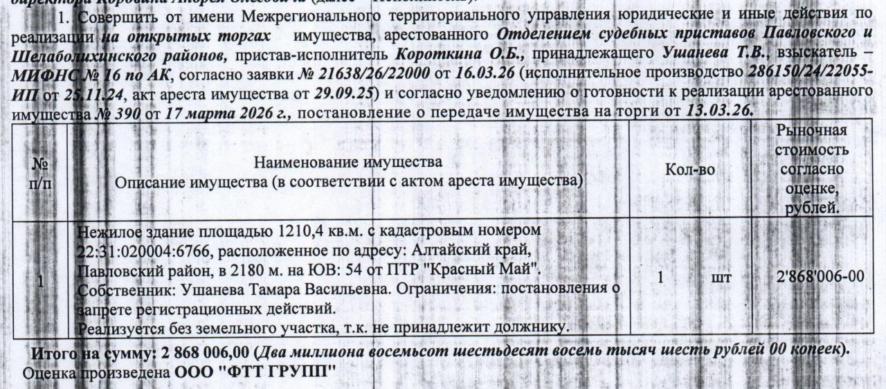 Лот5 Нежилое здание (без земельного участка), 1972 г.п., кадастровый 22:31:020004:6766, площадь 1210,4 кв.м., количество этажей 1, адрес: Алтайский край, Павловский район, в 2180 м на ЮВ: 54 от ПТР "Красный Май". Здание продается без зем. участка, т.к. зем. участок принадлежит другому собственнику. Начальная цена 2 868 006 руб. 00 коп. (Ушанева Т.В., запреты на совершение регистрационных действий) (390).