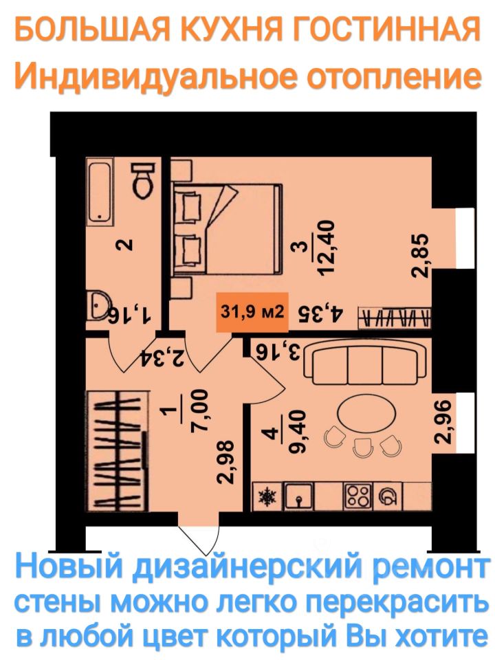 2) Квартира имеет очень удобную планировку - как ЕВРО ДВУШКА с большой кухней где можно жить, записывайтесь на просмотр и убедитесь сами)
