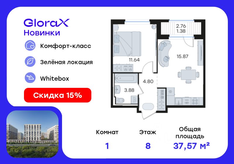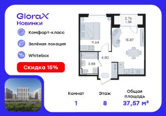 Продается 1-комн. квартира на 8-м этаже в строящемся проекте комфорт-класса GloraX Новинки. Общая площадь лота составляет 37,57 кв. м, из которых 11,64 кв. м отведено под жилую и 15,87 кв. м под кухонную зону. Номер квартиры - 85.
