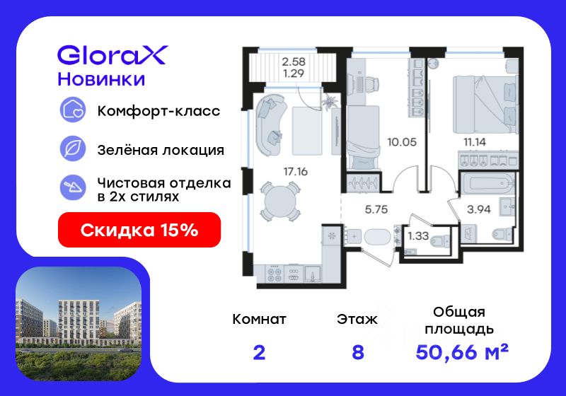 Продается 2-комн. квартира на 8-м этаже в строящемся проекте комфорт-класса GloraX Новинки. Общая площадь лота составляет 50,66 кв. м, из которых 21,19 кв. м отведено под жилую и 17,16 кв. м под кухонную зону. Номер квартиры - 202.