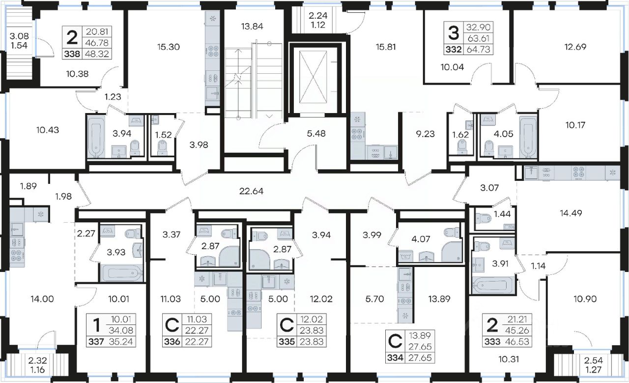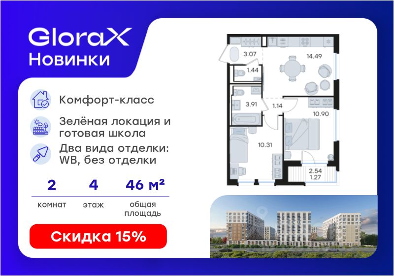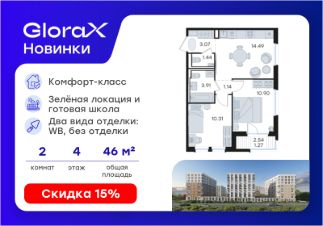 Продается 2-комн. квартира на 4-м этаже в строящемся проекте комфорт-класса GloraX Новинки. Общая площадь лота составляет 46,53 кв. м, из которых 21,21 кв. м отведено под жилую и 14,49 кв. м под кухонную зону. Номер квартиры - 333.