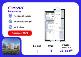 Продается квартира-студия на 4-м этаже в строящемся проекте комфорт-класса GloraX Новинки. Общая площадь лота составляет 23,83 кв. м, из которых 12,02 кв. м отведено под жилую и 5,00 кв. м под кухонную зону. Номер квартиры - 335.