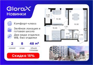 Продается 2-комн. квартира на 8-м этаже в строящемся проекте комфорт-класса GloraX Новинки. Общая площадь лота составляет 48,32 кв. м, из которых 20,81 кв. м отведено под жилую и 15,30 кв. м под кухонную зону. Номер квартиры - 366.