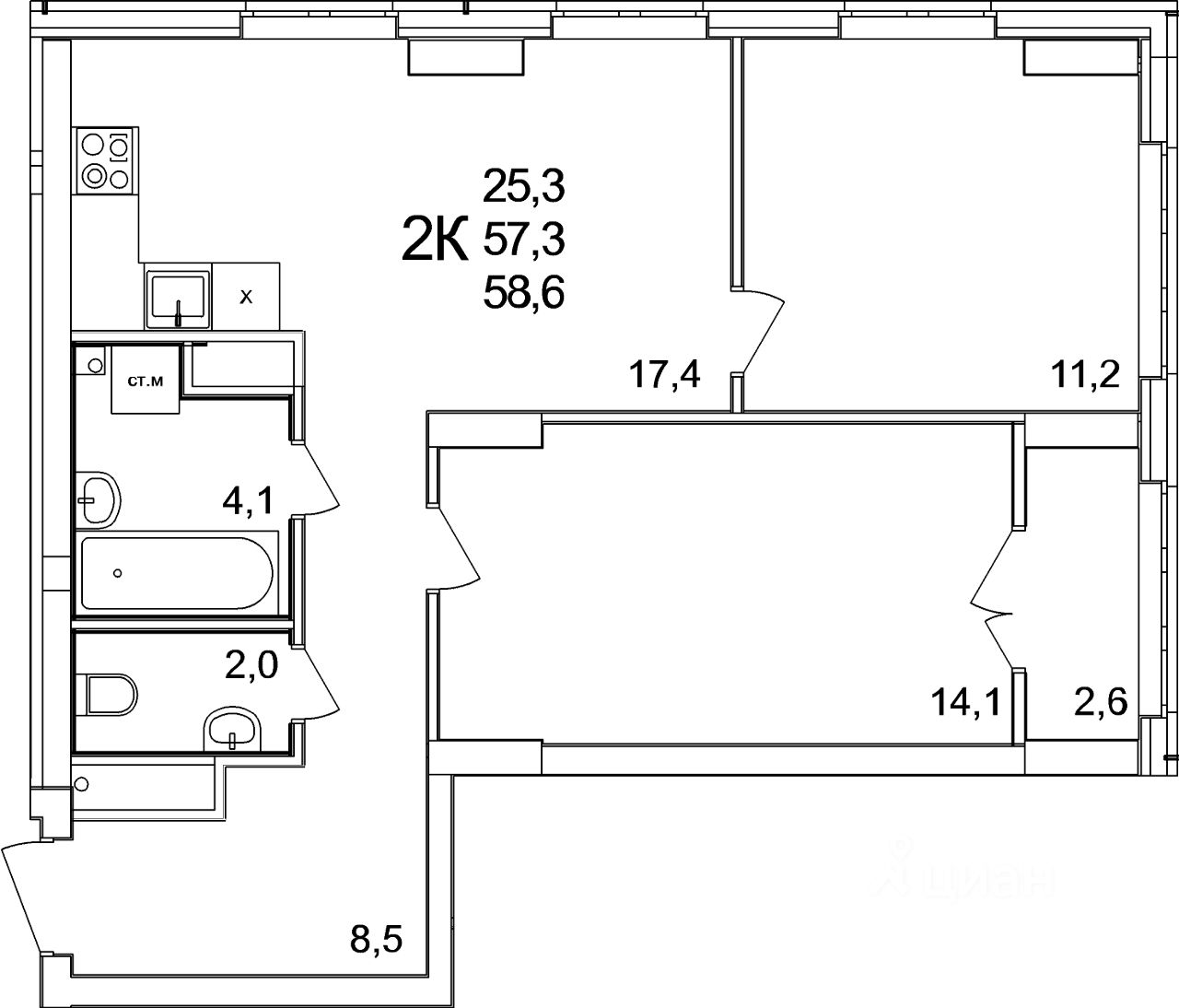 Общая площадь58,6 м²