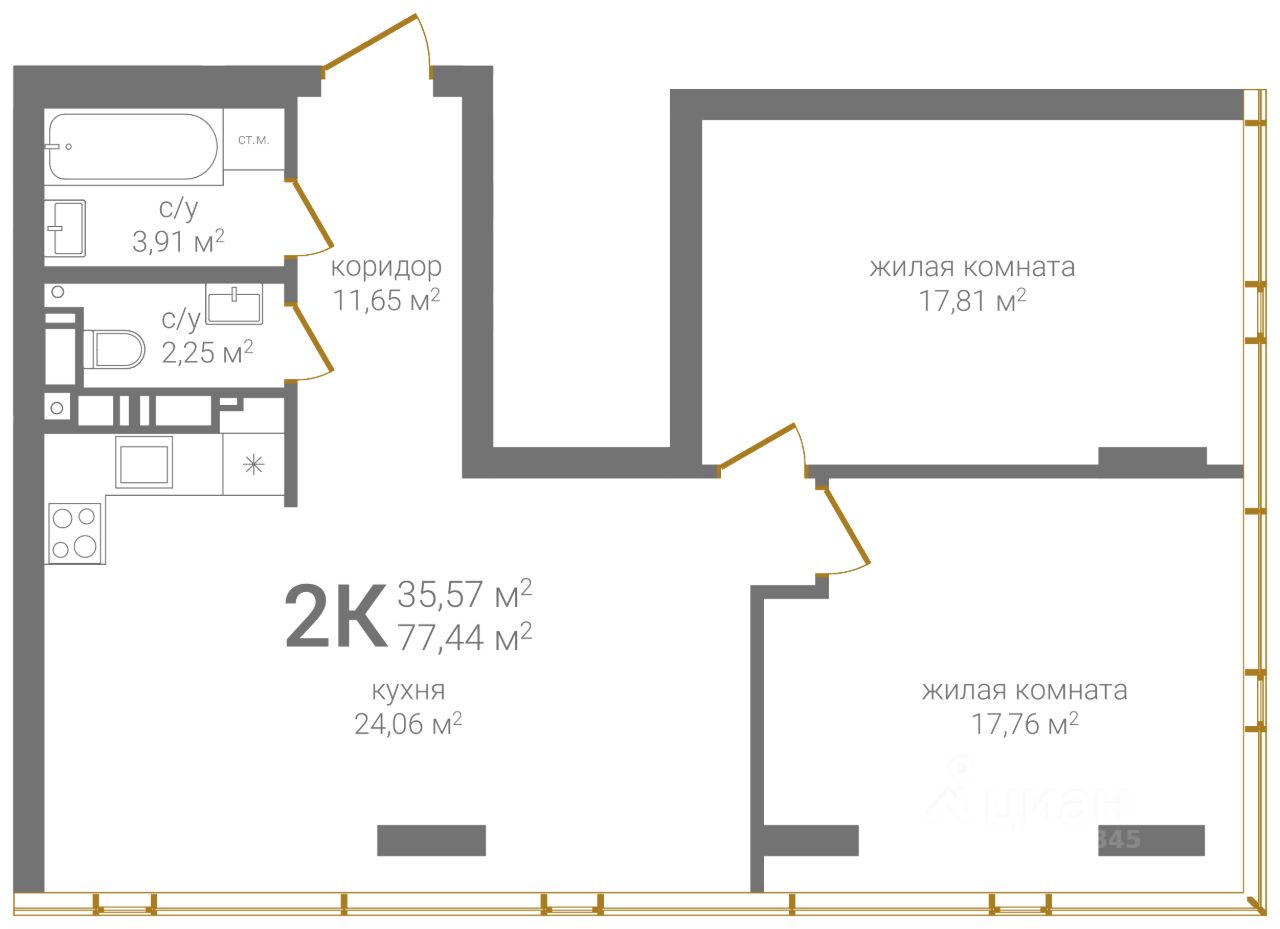 Общая площадь77,44 м²