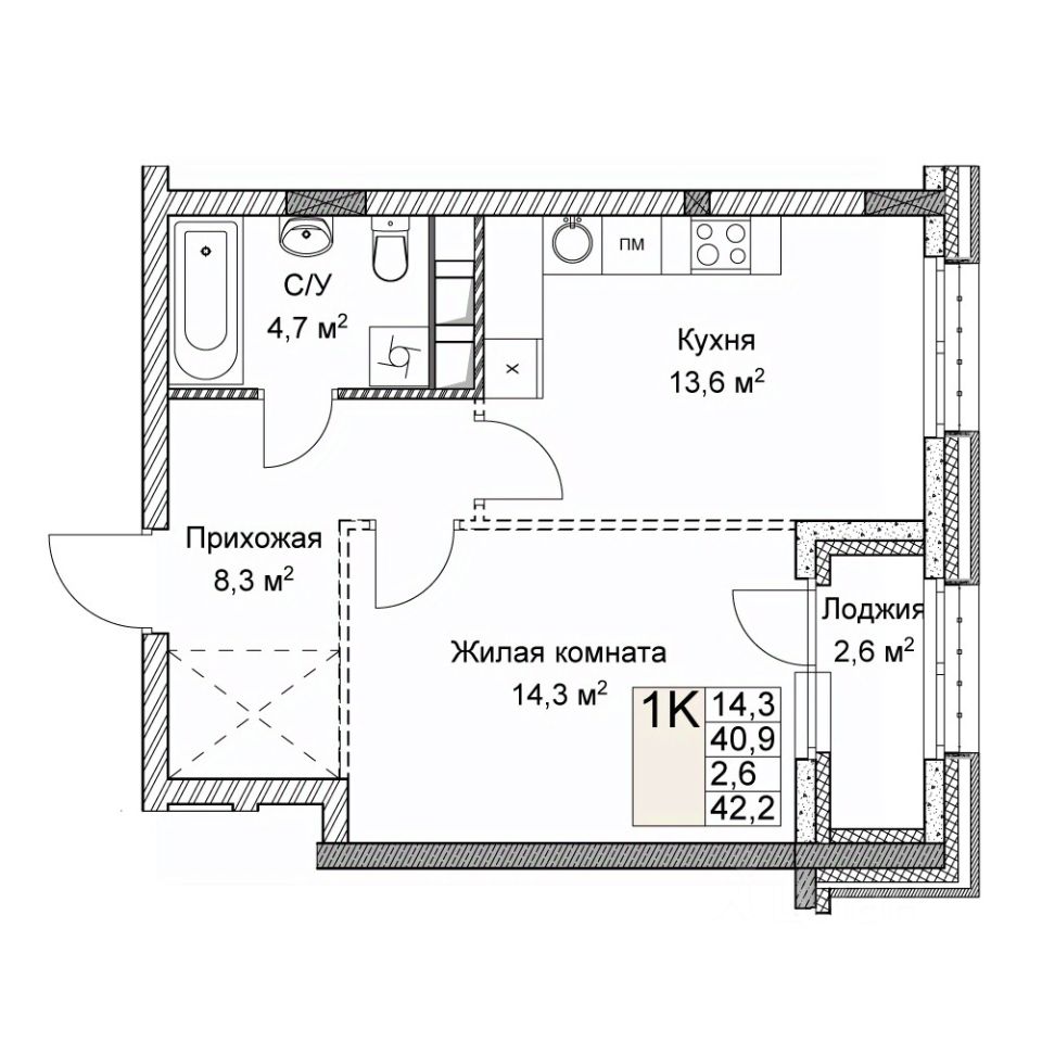 Квартира свободной планировки, 42,2 м²
