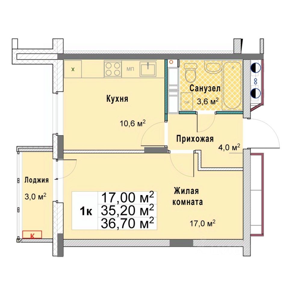 Общая площадь36,7 м²