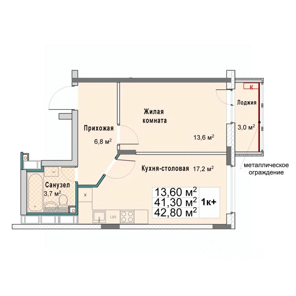 Общая площадь42,8 м²
