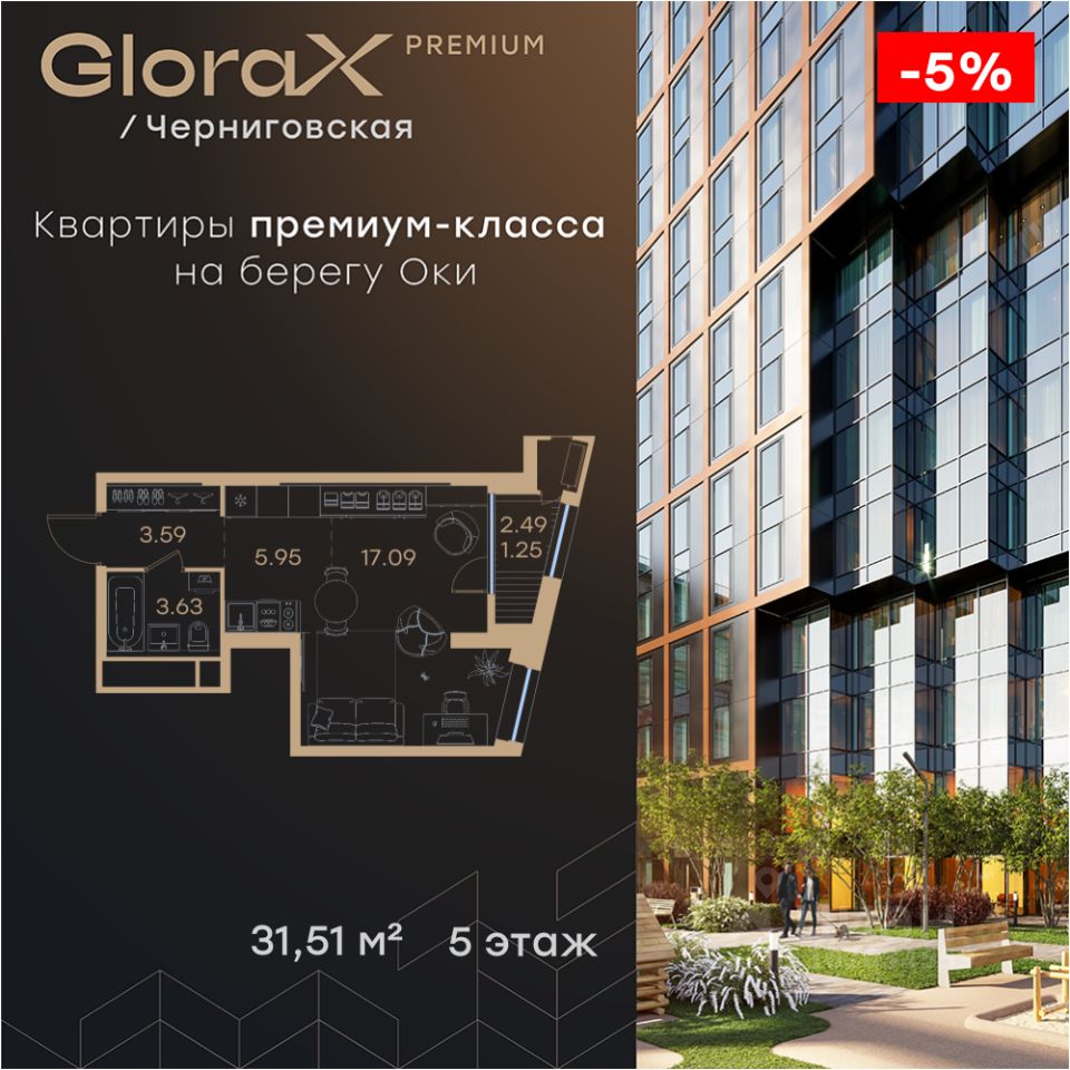 Продается квартира-студия на 5-м этаже в строящемся проекте премиум-класса GloraX Premium Черниговская. Общая площадь лота составляет 31,51 кв. м, из которых 17,09 кв. м отведено под жилую и 5,95 кв. м под кухонную зону. Номер квартиры - 24.