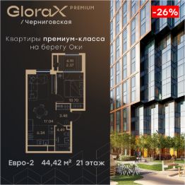 Продается 1-комн. квартира на 21-м этаже в строящемся проекте премиум-класса GloraX Premium Черниговская. Общая площадь лота составляет 44,42 кв. м, из которых 10,70 кв. м отведено под жилую и 23,38 кв. м под кухонную зону. Номер квартиры - 450.