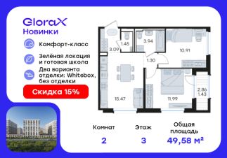 Продается 2-комн. квартира на 3-м этаже в строящемся проекте комфорт-класса GloraX Новинки. Общая площадь лота составляет 49,58 кв. м, из которых 22,90 кв. м отведено под жилую и 15,47 кв. м под кухонную зону. Номер квартиры - 27.