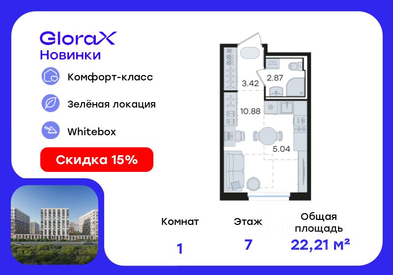 Продается квартира-студия на 7-м этаже в строящемся проекте комфорт-класса GloraX Новинки. Общая площадь лота составляет 22,21 кв. м, из которых 10,88 кв. м отведено под жилую и 5,04 кв. м под кухонную зону. Номер квартиры - 80.