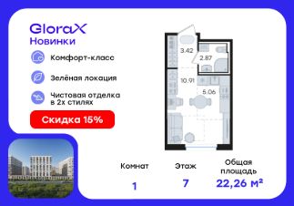 Продается квартира-студия на 7-м этаже в строящемся проекте комфорт-класса GloraX Новинки. Общая площадь лота составляет 22,26 кв. м, из которых 10,91 кв. м отведено под жилую и 5,06 кв. м под кухонную зону. Номер квартиры - 188.