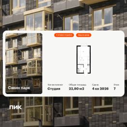 Продаётся квартира-студия площадью 22,8 кв.м на 7 этаже 25 этажного дома (Корпус 10, Секция 1) проекта ПИК Савин парк. Светлый просторный подъезд на уровне земли, функциональная планировка, большие окна, c отделкой.