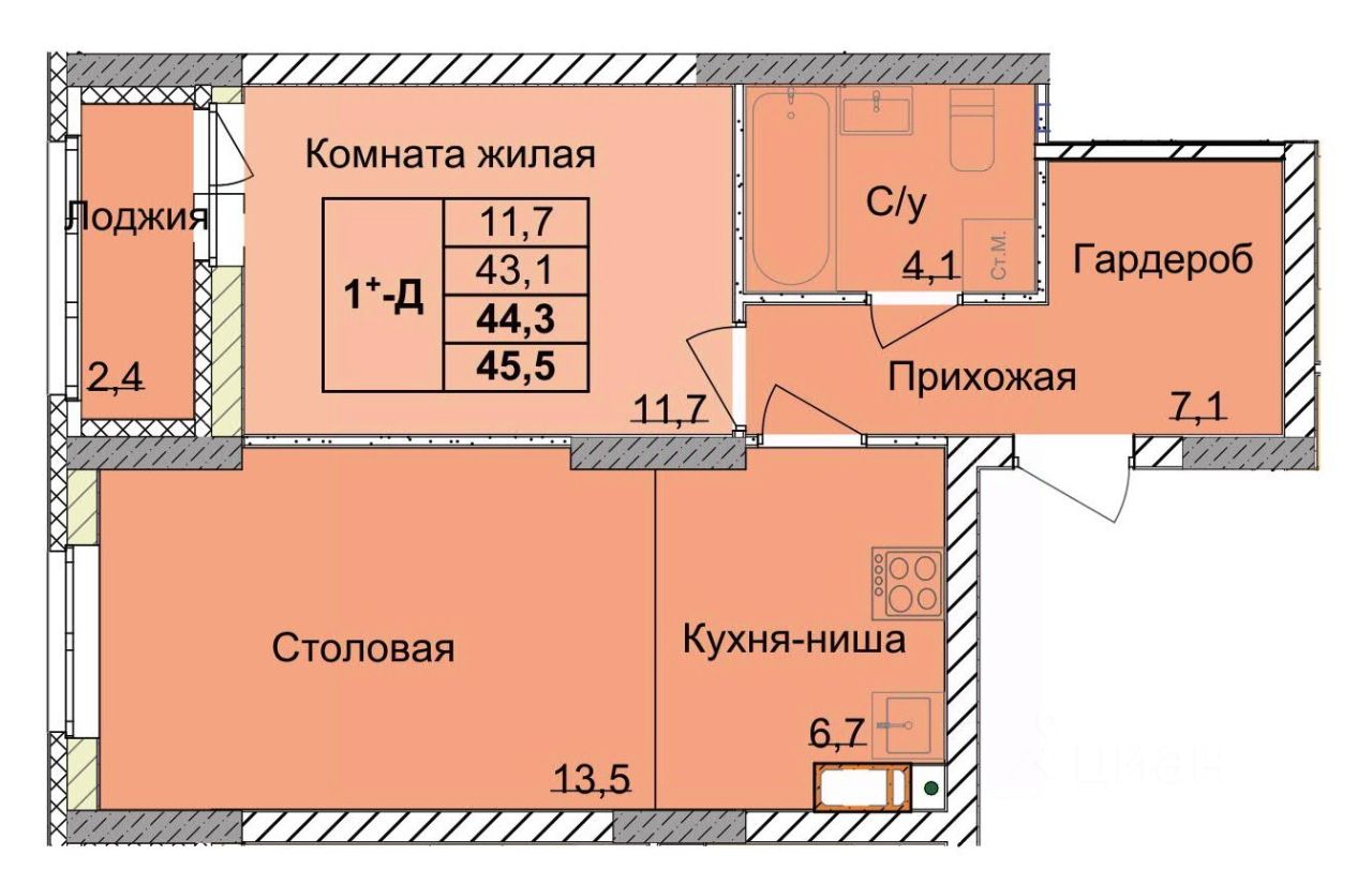 Общая площадь42,9 м²