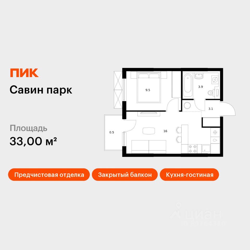 Продаётся 1-комн. квартира площадью 33 кв.м на 23 этаже 25 этажного дома (Корпус 8, Секция 1) проекта ПИК Савин парк. Светлый просторный подъезд на уровне земли, функциональная планировка, большие окна, предчистовая отделка.