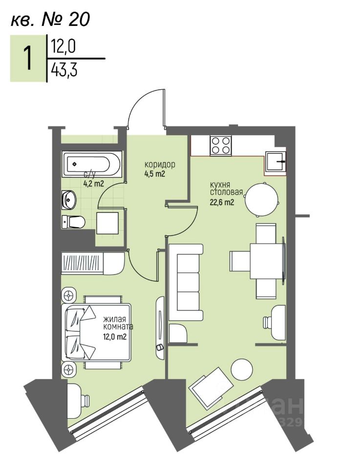 Общая площадь43,3 м²