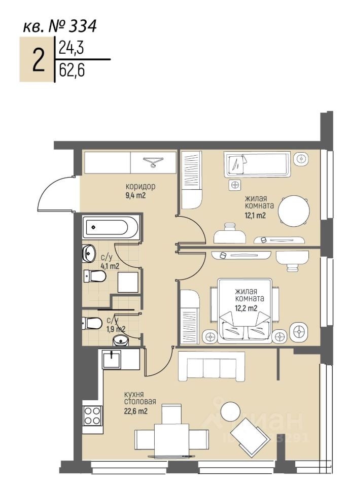 Жилая площадь24,3 м²