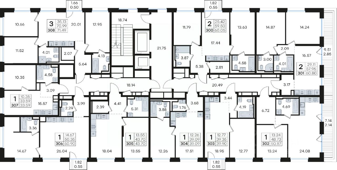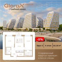 Продается 2-комн. квартира на 4-м этаже в строящемся проекте премиум-класса GloraX Premium Гребной канал. Общая площадь лота составляет 60,05 кв. м, из которых 25,42 кв. м отведено под жилую и 17,44 кв. м под кухонную зону. Номер квартиры - 300.