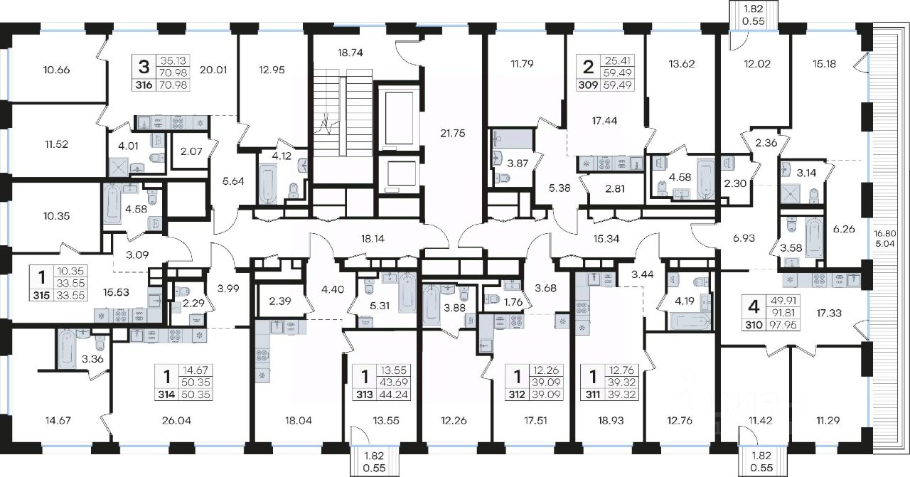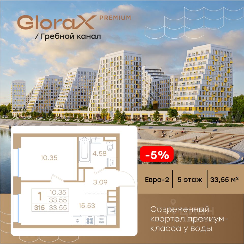 Продается 1-комн. квартира  на 5-м этаже в строящемся проекте премиум-класса GloraX Premium Гребной канал. Общая площадь лота составляет 33,55 кв. м, из которых 10,35 кв. м отведено под жилую и 15,53 кв. м под кухонную зону. Номер квартиры - 315.