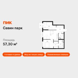 Продаётся 2-комн. квартира площадью 57,3 кв.м на 12 этаже 25 этажного дома (Корпус 10, Секция 1) проекта ПИК Савин парк. Светлый просторный подъезд на уровне земли, функциональная планировка, большие окна, c отделкой.