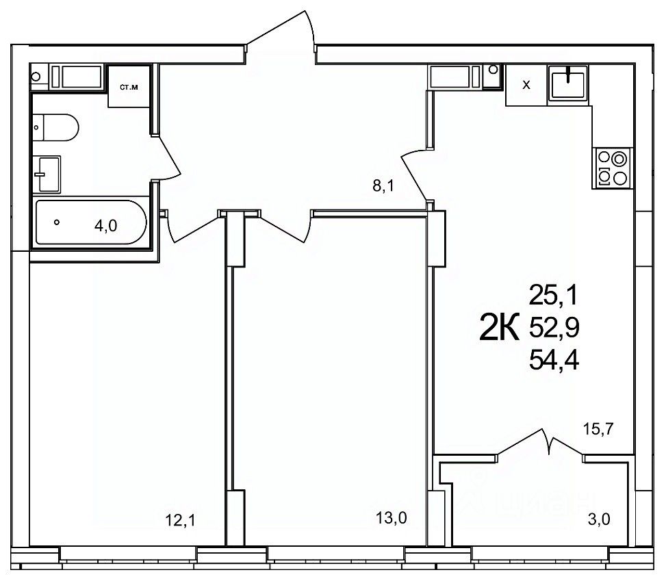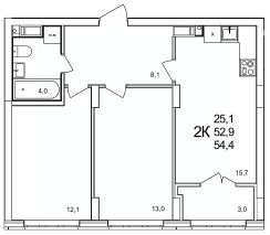 Общая площадь54,4 м²