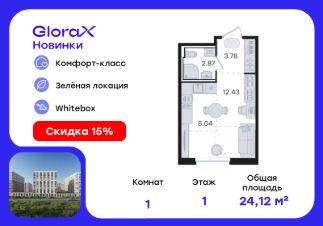 Продается квартира-студия на 1-м этаже в строящемся проекте комфорт-класса GloraX Новинки. Общая площадь лота составляет 24,12 кв. м, из которых 12,43 кв. м отведено под жилую и 5,04 кв. м под кухонную зону. Номер квартиры - 7.