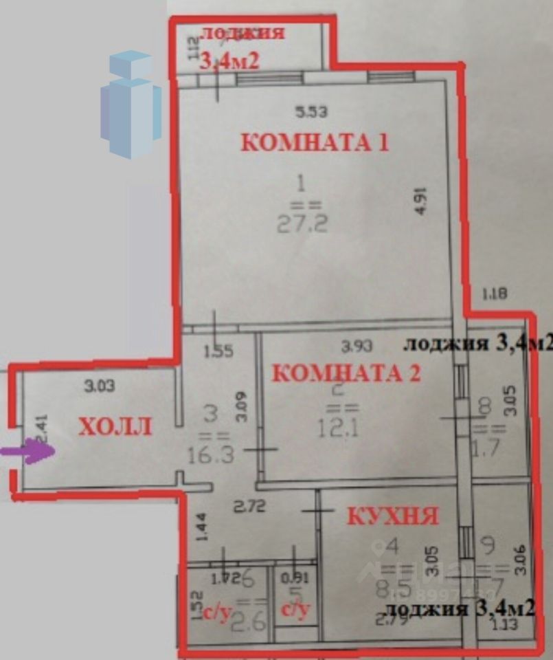 Эргономичная планировка: кухня 8,5м, две изолированных комнаты 27+12 м, огромный хол 16м, с/у раздельный, три вместительных лоджии по 3,4м каждая.
