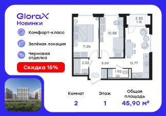 Продается 2-комн. квартира на 1-м этаже в строящемся проекте комфорт-класса GloraX Новинки. Общая площадь лота составляет 45,90 кв. м, из которых 21,84 кв. м отведено под жилую и 12,77 кв. м под кухонную зону. Номер квартиры - 600.