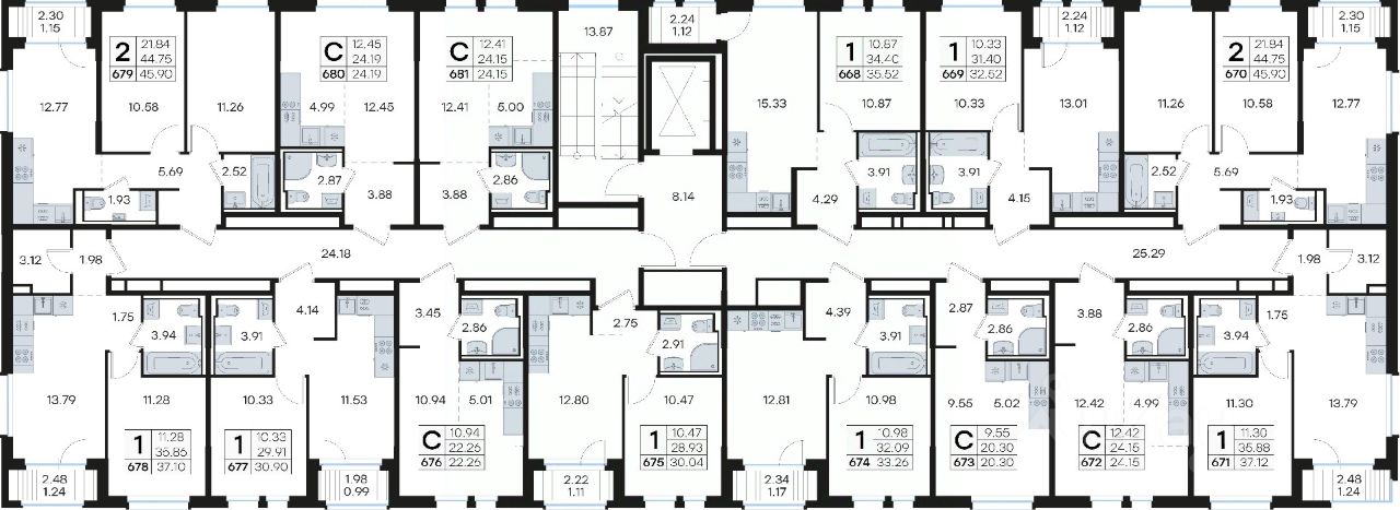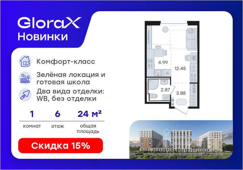 Продается квартира-студия на 6-м этаже в строящемся проекте комфорт-класса GloraX Новинки. Общая площадь лота составляет 24,19 кв. м, из которых 12,45 кв. м отведено под жилую и 4,99 кв. м под кухонную зону. Номер квартиры - 680.