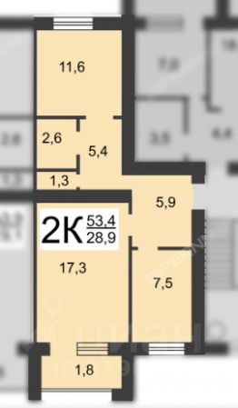 Планировка квартиры: две изолированные комнаты на разные стороны - гостиная 17 м2
