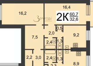 В продаже просторная 2-комнатная квартира, расположенная на 5/9 эт. дома, общей площадью 60,7 м, с кухней 9,2 м.
