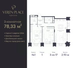 Просторная 2-комн. квартира в ЖК "VEREN PLACE Одесская" на 3 этаже. Квартира без отделки, полностью готова к ремонту. Общая площадь: 78.33 кв.м., жилая: 35.1 кв.м., площадь просторной куxни-гостиной: 26.06 кв.м. Квартира угловая, идеально подойдет любителям тишины и панорамных видов. В квартире два совмещенных санузла. Высота потолков 2.93 м.